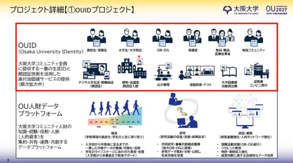 大阪大学では、OUDXの第一歩として、大阪大学に関わる人をつなげる「OUID」プロジェクトと、OUID基盤をベースに、人財を集約させ、学生と卒業生がつながる「OU人財データプラットフォーム」の構築に取り組みました。
