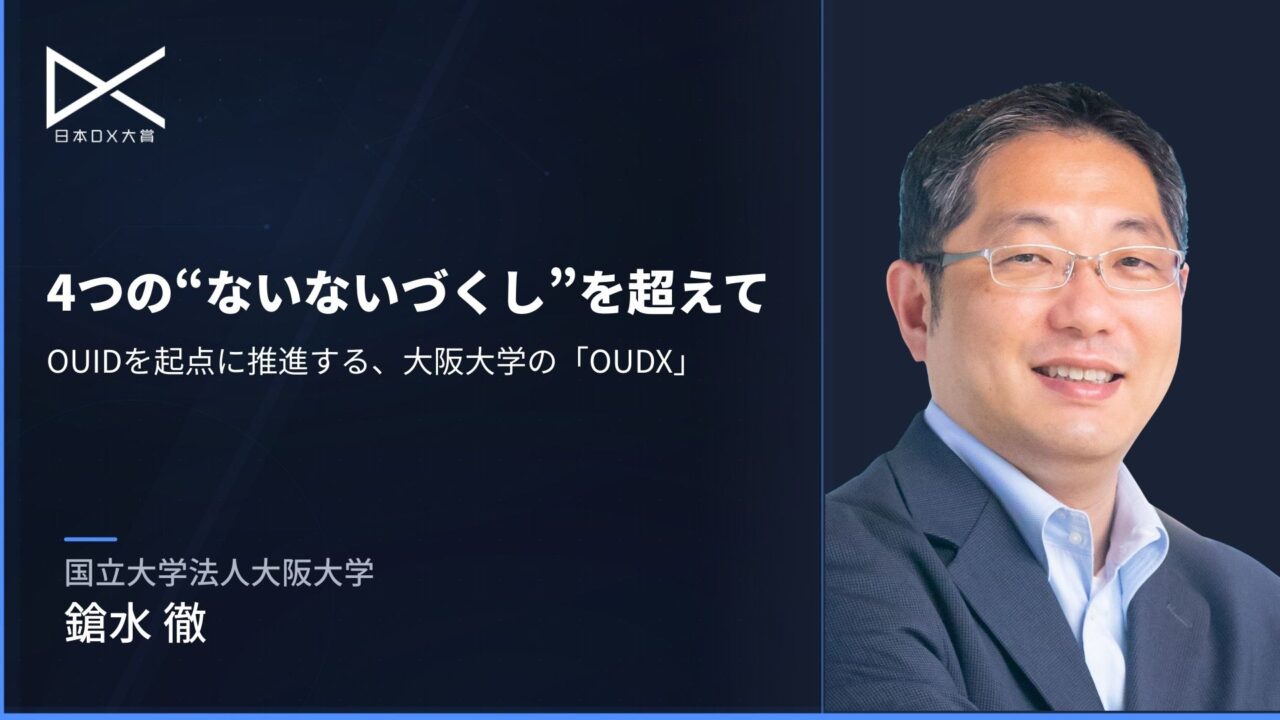 大阪大学の「OUDX」は、「ヒトがいない、カネがない、戦略と組織の動かし方がわからない」という壁に直面しながらも構築した、統合ID「OUID」、「OU人財データプラットフォーム」を起点としています。当初、3人しかいなかったDX推進担当は800人以上になり、コスト構造の見直しや大学実務へのDX/ITの翻訳、密にコミュニケーションを心がけることで、ボトムアップの組織変革にも成功しました。結果、4つの「ないないづくし」という障壁を突破。他の大学との共創、OUDXの取り組みの共有・提供などにより、日本の大学の国際競争力向上への貢献を目指しています。