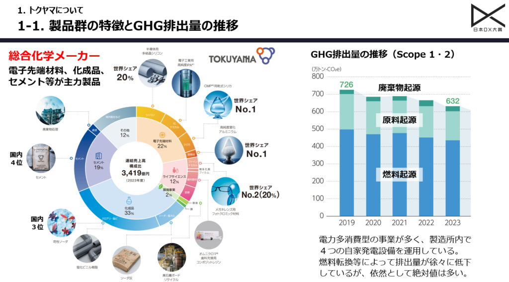 こうした課題は、総合化学メーカーであるトクヤマでも例外ではありません。トクヤマは、主力製造拠点の徳山製造所(山口県周南市)に、マテリアル(塩素・水素など)とユーティリティー(電気・蒸気)が高度に統合された10以上の化学プラントを保有しています。