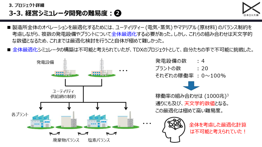 製造所全体のオペレーションを最適化するためには、マテリアル(原材料)や廃棄物、ユーティリティー(電気・蒸気)のバランス及び各供給網の制約を考慮しながら、発電設備とプラントの稼働を同時に全体最適化する必要がありました。しかし、稼働率の調整も含めて、これらの組み合わせは天文学的数値となるため、最適化検討を行うこと自体が難しく、これまで全体最適化シミュレーターの構築はほぼ不可能であると考えられていました。