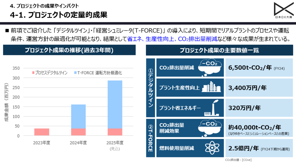 デジタルツインの導入により、2023年度は500万円弱の成果が生まれましたが、2024年度に運用を開始した「T-FORCE」による効果が積み上がり、今年度は3億円弱の成果となる見込みです。また、デジタルツインによる装置改良で年間6,500トンのCO2削減を実現しました。